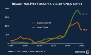 İnşaat maliyet endeksi Ocak’ta bir önceki aya kıyasla yüzde 15,32, yıllık bazda yüzde 78,52 yükseldi. Ayrıca, malzeme endeksi yüzde 69,01, işçilik endeksi yüzde 106,95 artış gösterdi. Veri aylık bazda 13 ayın zirvesi olarak kaydedildi.